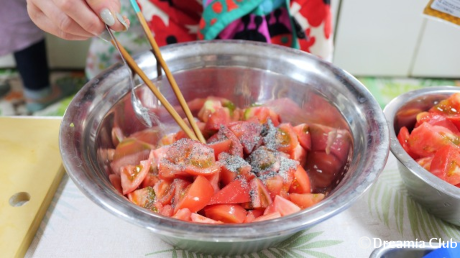 トマトとアスパラの黒ゴマ和えはしっかりと混ぜ合わせ、味をなじませていきます。