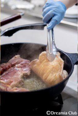 「チキンは皮と、膜と、肉の部分があって、膜の部分まで焼いていきたいんです。そこまで焼かないと、パリパリチキンにならなくて失敗しちゃう。でも、焦げちゃダメなので、火加減がとても重要です。弱火~中火の中火よりな感じで、火加減を見つつ焼いてくださいね。中火の加減は、ご家庭のフライパンでそれぞれ変わってきます。」