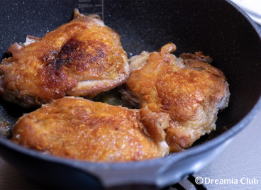 「チキンソテーってパリパリ感が難しいですよね。焼ききれていないからパリパリにならなかったり…。今日はその見極め方をお伝えしますね。パリパリチキンって、そこから出る油でチャーハンを作れたり、スープに使えたりして、とても有効活用できて便利なんですよ。」