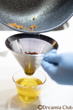 「このまま保存しちゃうと、カビが生えてしまいます。しっかり水分を飛ばし、脂が透明になるまで火を通して。これが“鶏油”ですよ。」