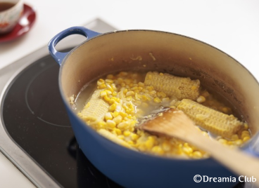 メニューのひとつである“とうもろこしポタージュ”のレッスンは、夏らしい黄色がテーブルを彩ってとても綺麗。