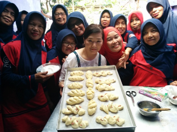 実は、このプロジェクトに参加する前、電気オーブンも小さい物しかないような、そんな場所で20名ぐらいの方に講習会をする、という機会があって。設備が不十分な中で20名分のパンを用意するということは中々ハードでした。それらをこなしていたことが、インドネシアで教える事の準備になっていたのかもしれません。インドネシアでは毎回300名近くの方に教えていたので。