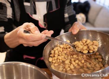 「味噌作りで大事なことは、しっかりとお豆を水につけること!ここで大豆が水分を含んでいないと、どんなに煮ても柔らかくなりません。」