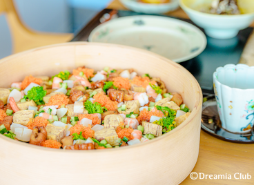「では盛りつけていきましょう。酢飯をすべて具で埋めつくすのがポイントで、のせる順番も研究しました!まずはくらげ、そして・・。のりや貝割れ大根はできるだけ目立たないようにします」