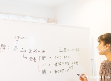 ホワイトボードを使いながら熱心にお話しする瀧本さんからは、「あれも、これも伝えておきたい」という愛が伝わってきます。具体的な食材の名前が挙がる度に、生徒さんは、瀧本さんがまとめた『中医食材辞典』(薬膳実践学院)を開いて確認。瀧本さんの話に耳を傾けながら、メモを取る横顔はとても真剣ですが、瀧本さんの話術に生徒さんからは笑いも溢れ、教室の雰囲気は和やか。「難しいことも易しく、おもしろく伝えたい」という瀧本さんの狙い通りです。