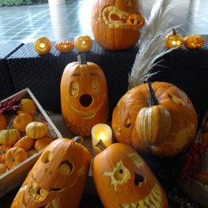 文字を入れたり、オドロオドロシイ目や口を彫ってみたり、西洋カボチャを使って世界に1つしかないお化けカボチャを作ります。