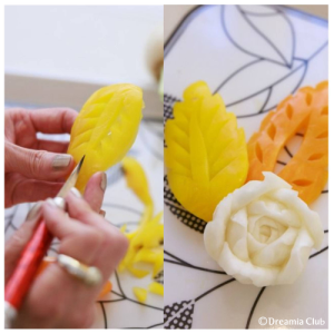 パプリカと蕪でささっと木の葉とバラを目の前で作ってくださいました。