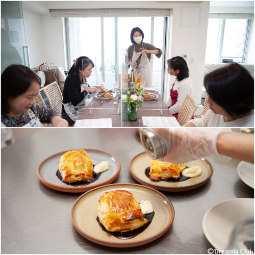 牛もも肉のパイ包み焼きでは、レッスン前にレシピを拝見したときは「なぜパン粉を使うのだろう?」と思っていたのですが、パン粉はパイ包みをサクサクに仕上げる重要なポイントで、それをレッスンで聞いたときは、しっかり計算されたレシピに感激してしまいました。