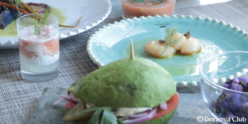 左写真手前がビーガンアボカドバーガー 他のお料理も色鮮やかで美しい