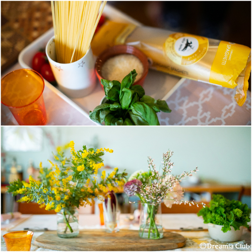お気に入りのオーガニックイタリア食材・アルチェネロのパスタ。季節の花もナチュラル感いっぱい。