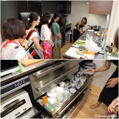 「前の教室では私が道具を出してご用意していましたが、こちらの教室ではぜひ自由に引き出しを開けて出してください。ザルやボウルはこちら、フライパンはこちらです。