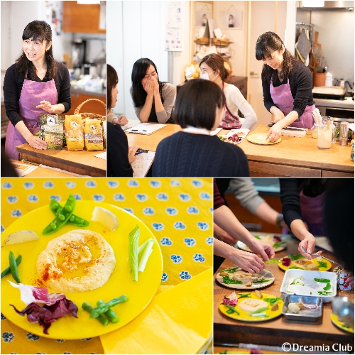「では次にフムスです。今回は春野菜のディップとして召し上がっていただく提案です。盛り付けもひと工夫しましょう。