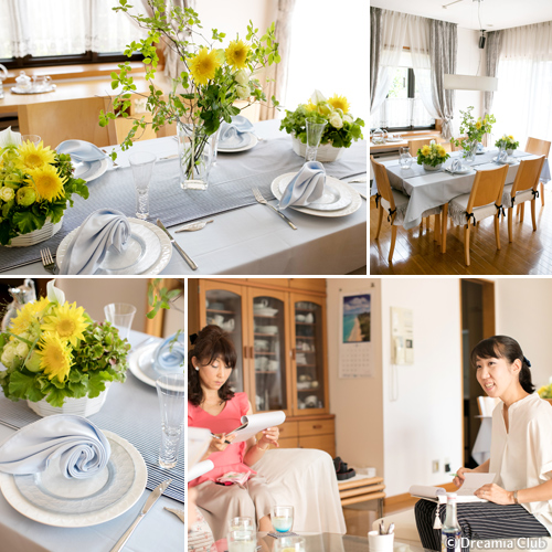 テーブルは、今日のレッスンのテーマ「夏のアメリカンなおもてなし」に合わせ、カリフォルニアのイメージでコーディネートされていて、とても爽やか。一気に気持ちが解放されて日常を忘れていくかのようです。