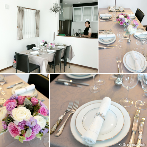 テーブルには、上品なグレージュのクロスが敷かれ、レストランのように素敵なセッティングが。華やかなフラワーアレンジメントは、表さんが所属する「花・芸術文化協会」のメンバーでもある相宮路子さんの作品だそう。