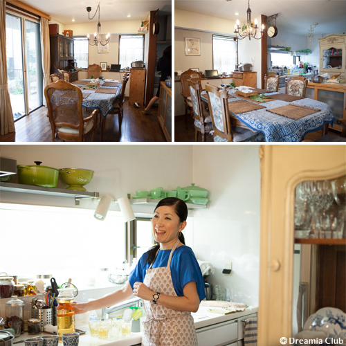 瀟洒な玄関を入りレッスンが行われるキッチン・ダイニングにお邪魔すると、広がっていたのは、アンティークな趣がある素敵なインテリアが配置された広々とした空間。壁一面の窓からは、風に揺れる庭のグリーンを眺めることができ、心がふわっと癒されます。