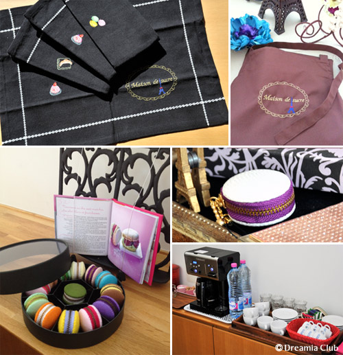 実は、裁縫など手芸も得意の安田さん。時間を見つけては、様々なものを作っているそう。例えば写真は、多目的に使えるナプキン。教室のロゴに加え、可愛らしいスイーツの刺しゅうが柄違いでほどこされています。そして思わず食べたくなってしまうマカロン型のケースも手作り。