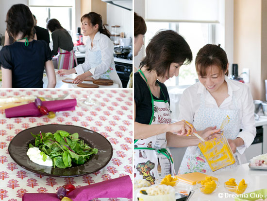 「ありがとうございます、そのお皿もフランスで買ってきたのですがサラダにもデザートにも合うので便利なんですよ。職人さんの手作りなので微妙に模様が違うのも味がありますよね(笑)。では、こんな感じで盛り付けをお願いしまーす」