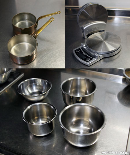 愛用の製菓道具もやはりこだわりが。銅鍋や立てて収納できるタニタのスケールは必需品