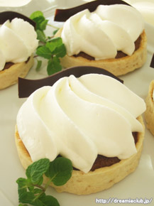 - 生クリームとグラニュー糖を泡立て、8. に絞り、好みのチョコレート飾りをのせる