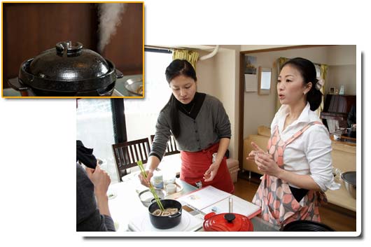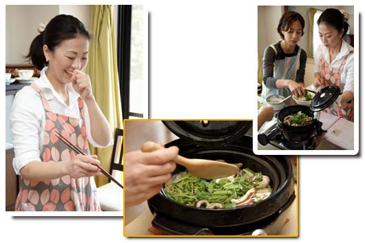 「今日はピラフを土鍋で作りますねー。これ、ecoかまどっていうんですけど、短時間でふっくらごはんが炊けて、ガス代も20%くらいカットできるそうなんです」