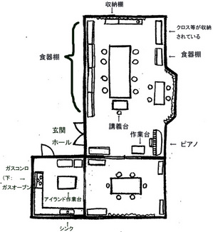 講義と実習が行われるメインルームは、10人掛けと4人掛けのテーブル、そしてピアノが置かれてもまだまだ余裕のある広さ。キッチンとのあいだのダイニングにも6人掛けほどのテーブルがあり、その奥にブラウンを基調としたキッチンが広がります。目をひくのはとにかく大きなアイランドです。