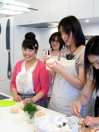 レッスンは週5日、午前と午後の1日2回開催されます。毎レッスンは6名で行われ、1ヶ月250名近く定員があるのにも関わらず、なかなか参加が出来ないと大人気のレッスンは、先生とキッチンを囲んで一緒につくるスタイル。タイミングよくお料理のポイントをレクチャーし、常に笑顔と会話が絶えないにぎやかな教室です。三溝さんのレッスンでは、初めてきた方でも、すぐに溶け込めるようなアットホームな暖かさを感じます。実際、生徒さんもこの教室を通じ友達が増えたと口を揃えるのもうなずけます。