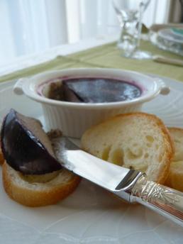 赤ワインは小鍋で半量になるまで煮詰め、蜂蜜とふやかしておいたゼラチンを溶かしいれ、レバーの上に流し入れて、冷蔵庫で冷やし固める。
