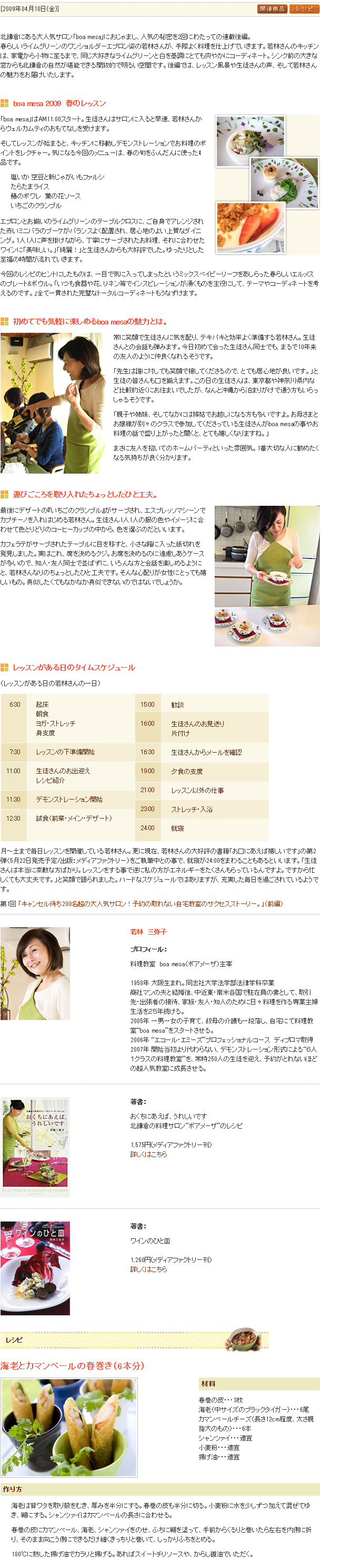 キッチンと暮らしのまん中で輝く人教室ストーリー キャンセル待ち200名超の大人気サロン!予約の取れない自宅教室のサクセスストーリー 2009/04/10 boa mesa 若林 三弥子 教室紹介はこちら 第5回目にご登場いただくサロネーゼは、今ではレッスンのキャンセル待ちがなんと200名を超える、大人気の自宅サロン「boa mesa(ボアメーザ)」を主宰している若林三弥子さんです。人気の秘密を2回にわたってお届けします。 ← キャンセル待ち200名超の大人気サロン!予約の取れない自宅教室のサクセスストーリー パン作りを通じて”ママになっても好きな事で輝いて欲しい” → 前の記事はこちら 次の記事はこちら