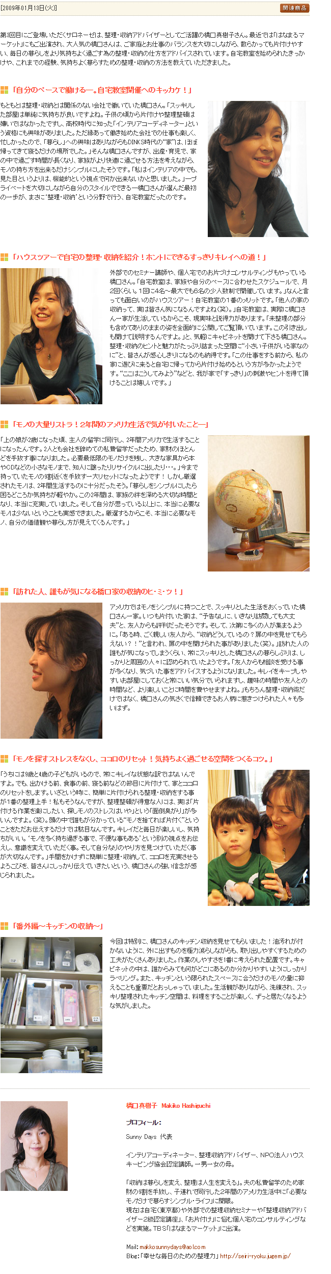 第3回目にご登場いただくサロネーゼは、整理・収納アドバイザーとしてご活躍の橋口真樹子さん。最近では「はなまるマーケット」にもご出演され、大人気の橋口さん。ご家庭とお仕事のバランスを大切にしながら、散らかっても片付けやすい、毎日の暮らしをより気持ちよく過ごす為の整理・収納の仕方をアドバイスされています。自宅教室を始められたきっかけやこれまでの経験、気持ちよく暮らすための整理・収納方法を教えていただきました。