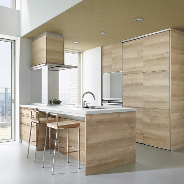 料理に集中できる独立型キッチンのマンションリフォーム。 扉は自然素材の質感を取り入れました。