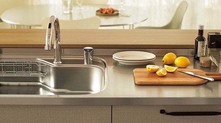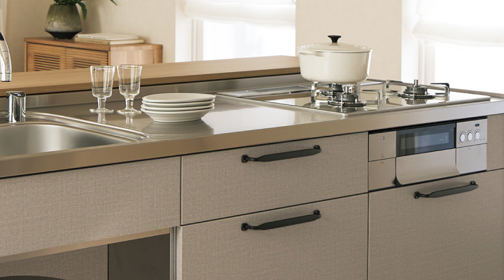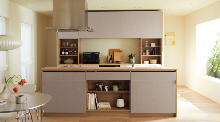 調理するエリアとリビング・ダイニングの家族エリアの表情を2つの扉面材で使い分けられる対面キッチン。