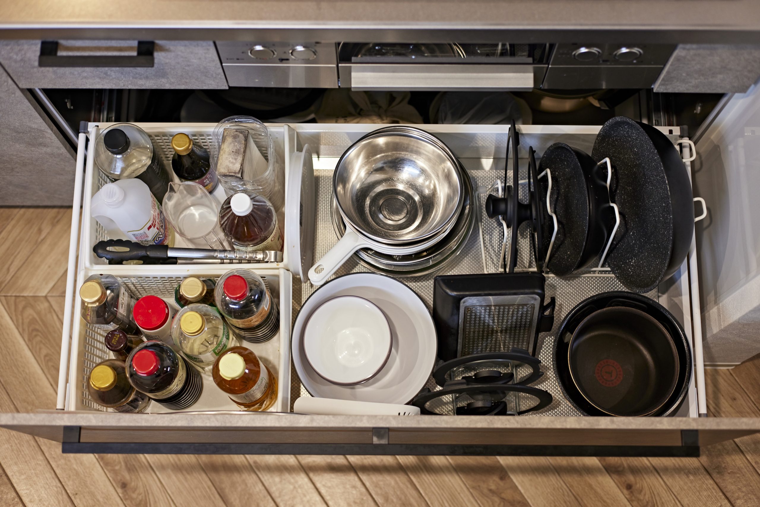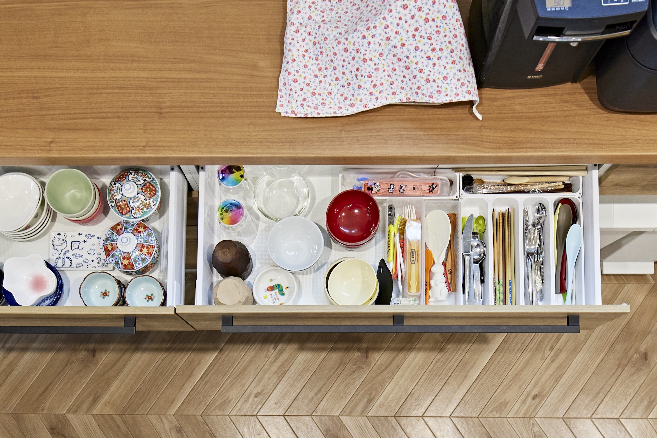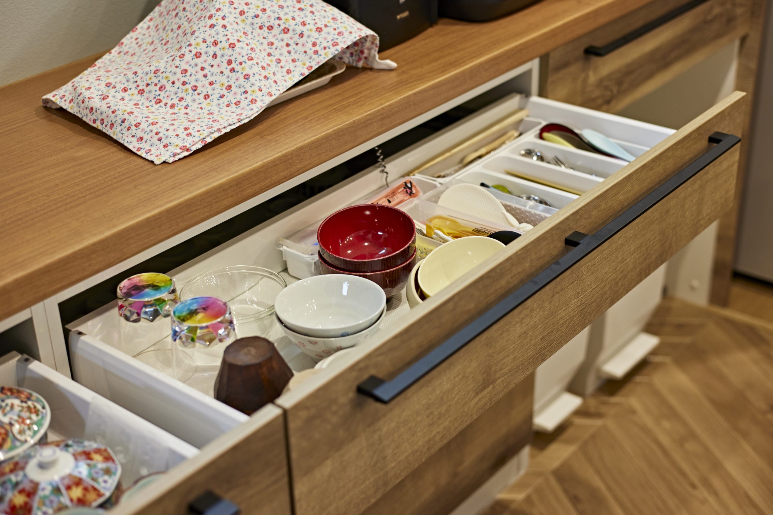 コンロキャビネットやシンクキャビネット、背面収納など、収納スペースも充実。普段使いの食器や調理用具、調味料などがサッと出し入れできるため、ワークトップに「出しっぱなし」にならず、すっきりと整ったキッチンが実現しました。