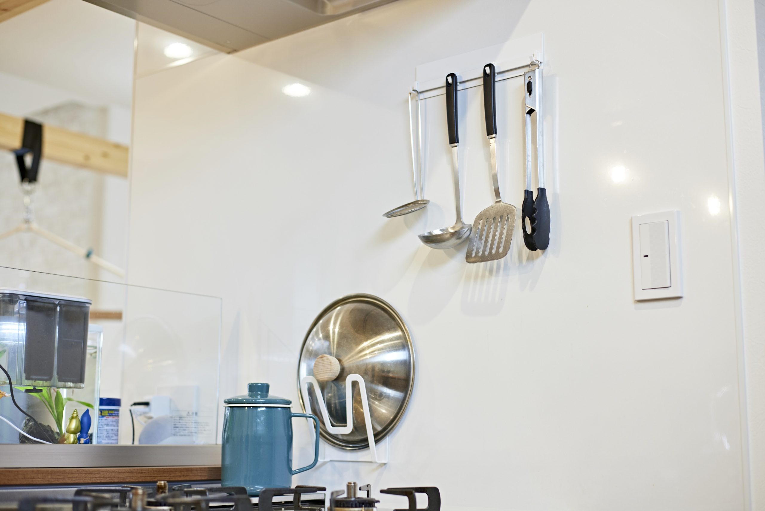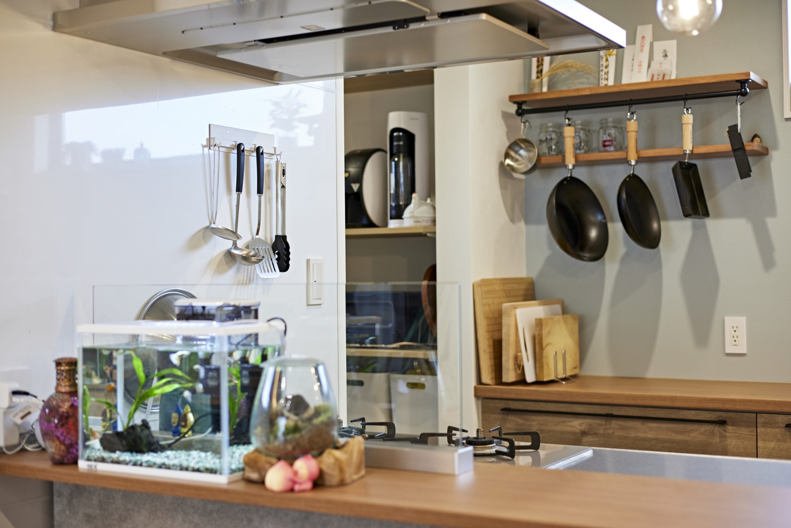 一方で、リビング側からの見え方も考えて、生活感が出やすい家電やストック類はパントリーにまとめて、“隠せる収納スペース”として活用。お気に入りの調理用具は特注の飾り棚に吊り下げて、“見せる収納”にしたことでインテリアにアクセントが加わり、来客時にも空間がすっきりと整っています。
