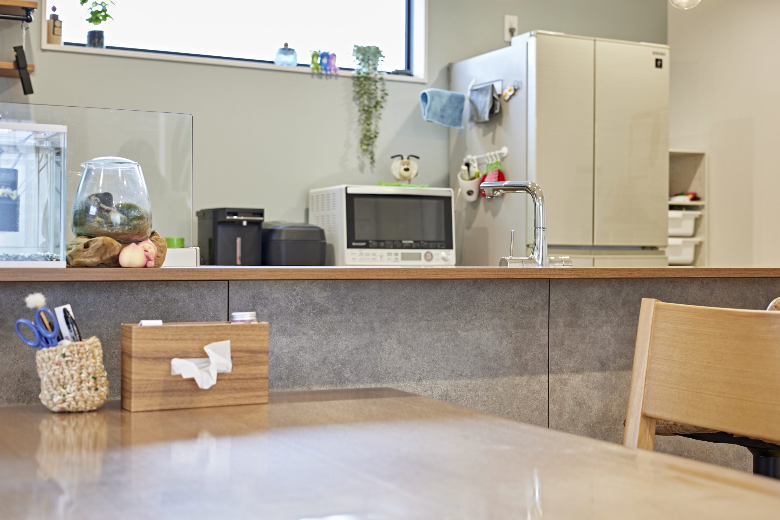 「アイランド型にも憧れはあったのですが、LDKの広さを考えると少し圧迫感が出てしまいそうだなと思い、I型の造作対面を選択しました。リビングに向き合いながらも手元は隠せるデュアルトップ対面は理想的でしたね」と奥さま。