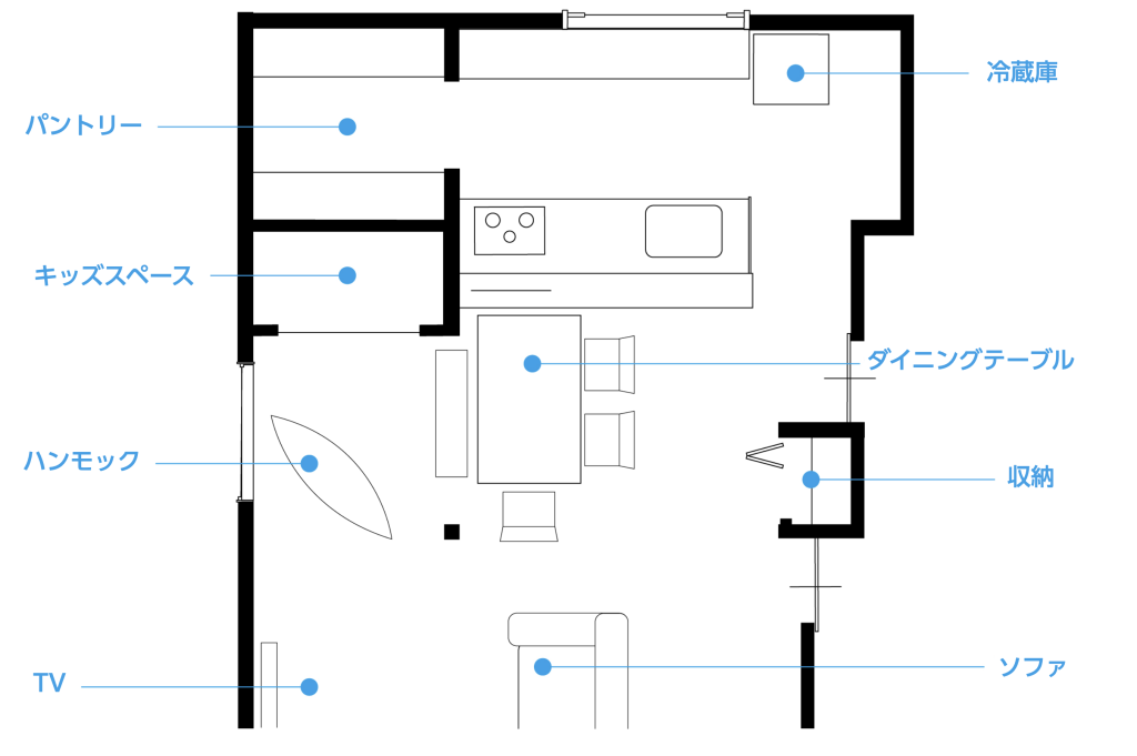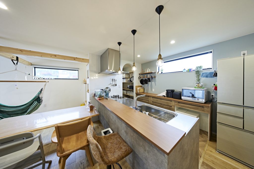 キッチン端にパントリーを設けたことで、その裏側に小さな“隠れ家”のような空間が誕生。絵本を読んだり、おままごとをしたりと、娘さんのお気に入りの一角になりました。そのキッズスペースの前にはハンモックを吊るし、ご主人がくつろぎながら娘さんを見守っています。