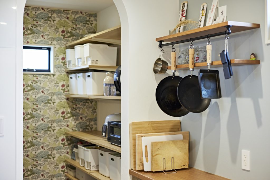 一方で、リビング側からの見え方も考えて、生活感が出やすい家電やストック類はパントリーにまとめて、“隠せる収納スペース”として活用。お気に入りの調理用具は特注の飾り棚に吊り下げて、“見せる収納”にしたことでインテリアにアクセントが加わり、来客時にも空間がすっきりと整っています。