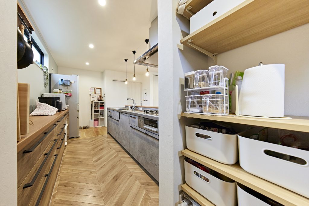 「キッチンはかっこよく仕上げながら、家全体としてはナチュラルな雰囲気を保ちたいという希望に叶うデザインでした。キッチンの床材をヘリンボーンにした点も、こだわったポイントですね」