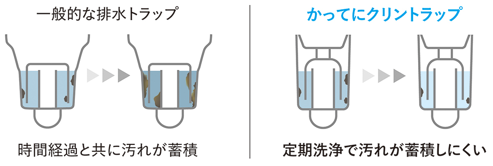 汚れる場所を隠して見えないようにする排水トラップもありますが、それでは汚れやニオイに対して根本的な解決にはなりません。専業メーカーとしてお客様の負担を極力少なくしながらキレイをラクに保てるようにしたいと考えました。